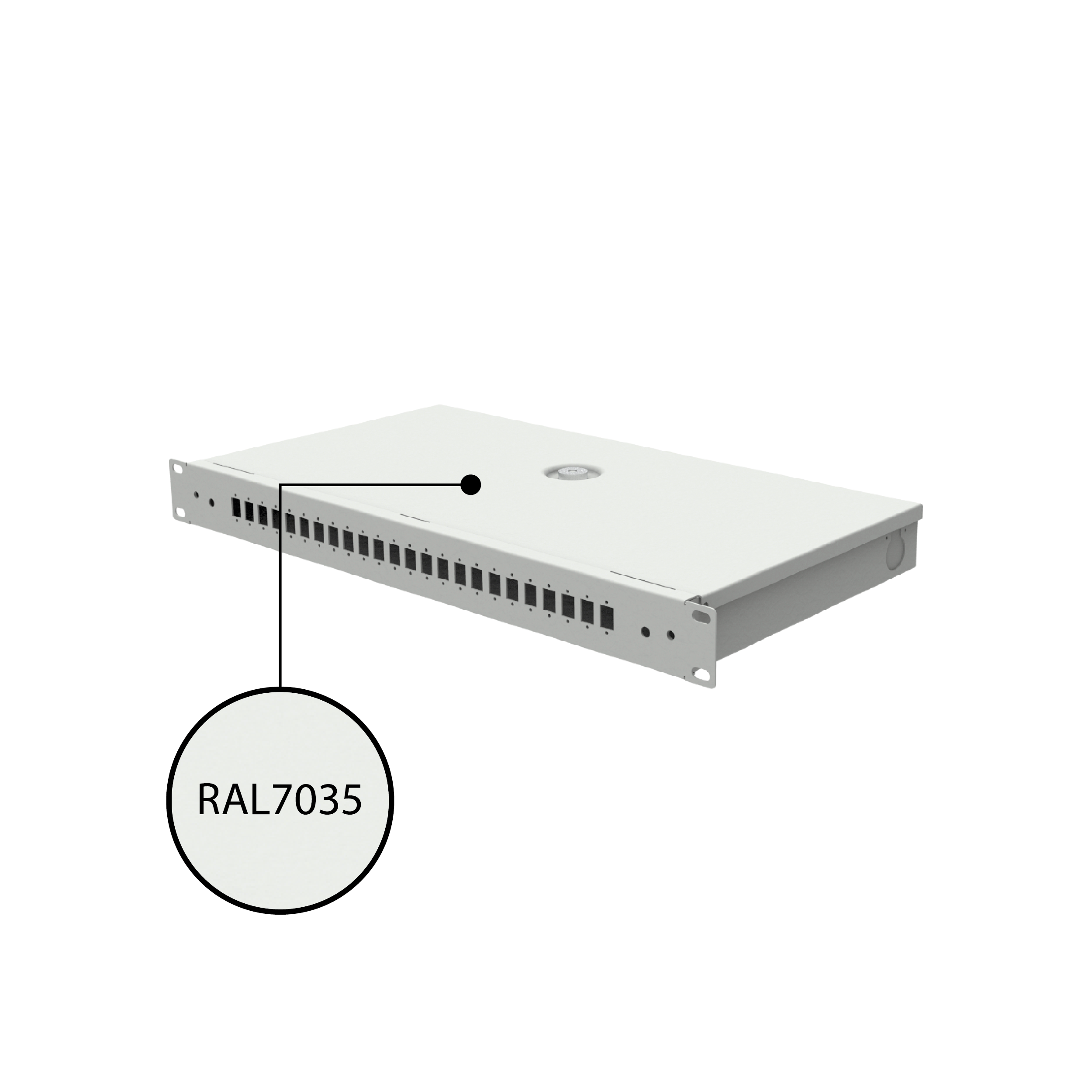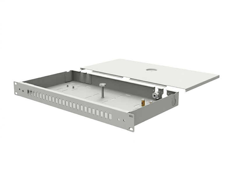 Oferowany produkt to przełącznica światłowodowa przeznaczona do montażu w szafie Rack 19", wysokość wynosi 1U. Wewnątrz przełącznicy znajduje się miejsce (śruba) do zamontowania tacki spawów, tacka nie jest dołączone w zestawie. Blacha posiada perforacje, które umożliwiają przypięcie kabli przy pomocy opasek zaciskowych, co ułatwia zorganizowanie okablowania. Produkt został wykonany z blachy stalowej pokrytej powłoką Magnelis i pomalowany proszkowo w kolorze jasnoszarym (RAL7035).