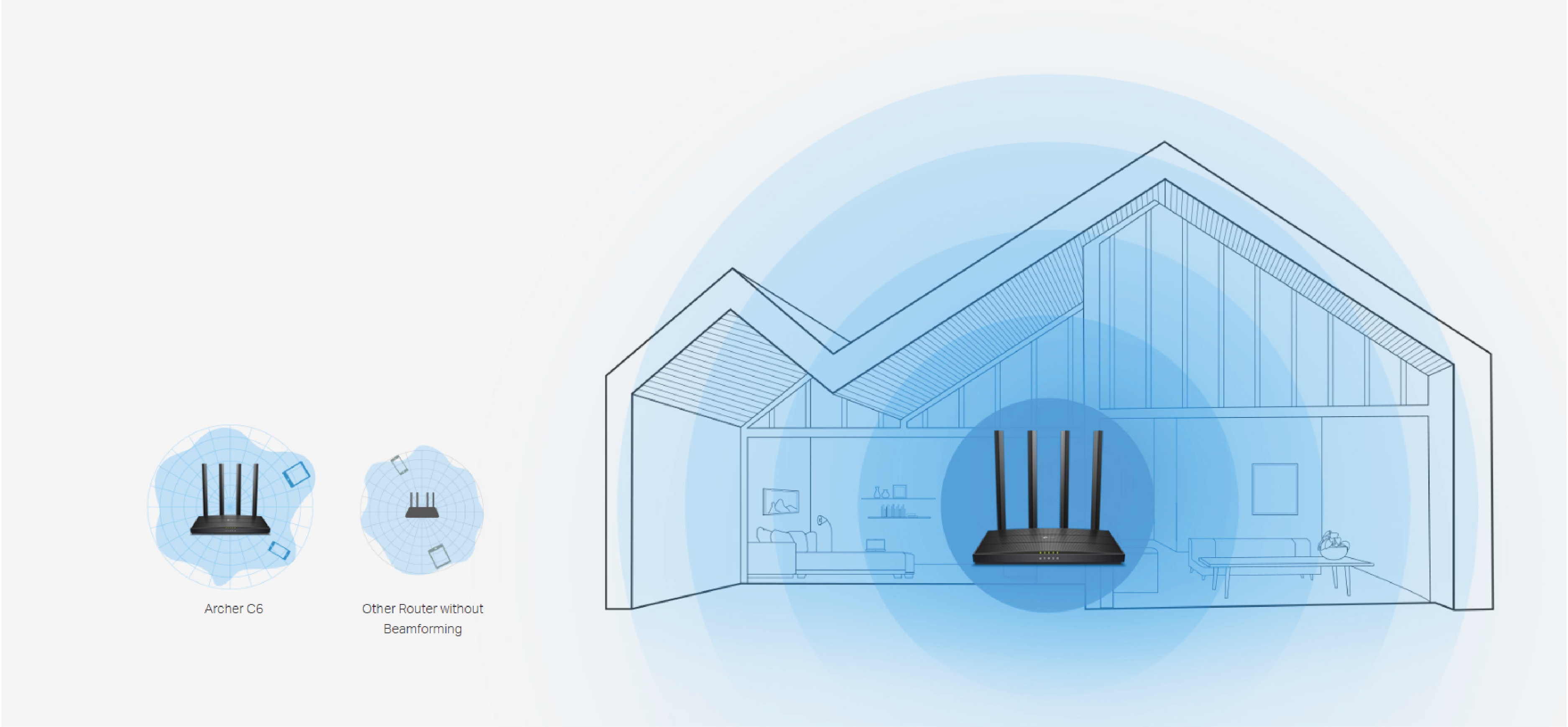 Cztery anteny zewnętrzne o wysokiej wydajności dostarczą sygnał Wi-Fi do każdego zakątka twojego domu. Technologia Beamforming umożliwia wykrywanie urządzeń i przesyłanie w ich kierunku mocnego sygnału Wi-Fi, nawet jeśli znajdują się w odległej lokalizacji.