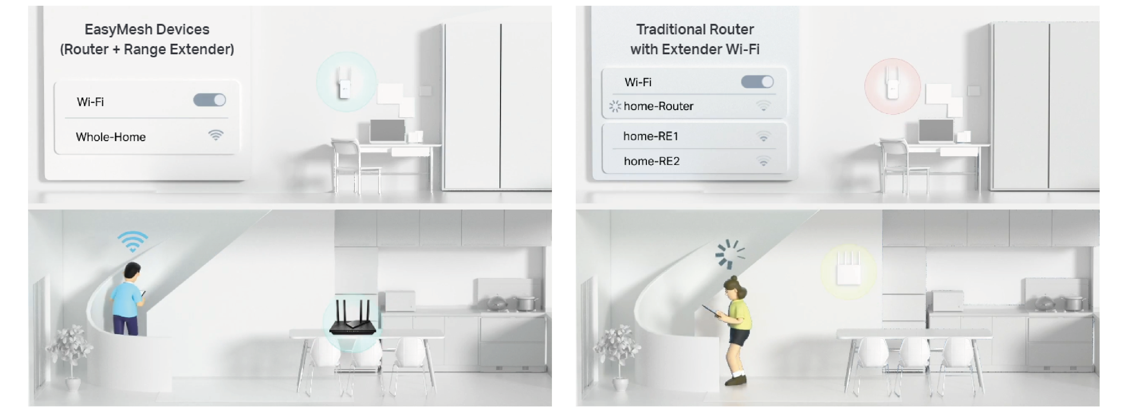 Jeśli w Twoim domu występują martwe strefy zasięgu, po prostu dodaj kolejne urządzenia kompatybilne z EasyMesh, aby rozbudować domową sieć WiFi Mesh. Zapomnij o szukaniu stabilnego sygnału połączenia.