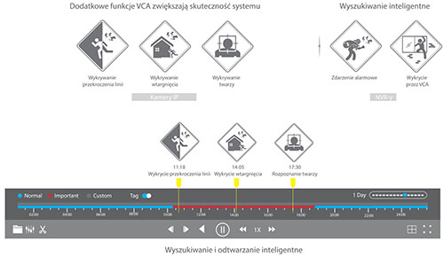 Technologia Video Content Analytics (analiza treści wideo) nie jest już dostępna wyłącznie w systemach bezpieczeństwa kierowanych do korporacji. Dzięki rozwiązaniu EasyIP mogą się nią cieszyć także małe i średnie firmy. Personel otrzymuje do rąk narzędzie Smart Search (wyszukiwanie inteligentne), które można wykorzystywać w połączeniu ze zdarzeniami alarmowymi i wykrywaniem zdarzeń w oparciu o VCA, a także funkcję Smart Playback (odtwarzanie inteligentne), która pozwala obejrzeć zarejestrowany moment przekroczenia wirtualnej linii, wtargnięcia lub twarze osób.