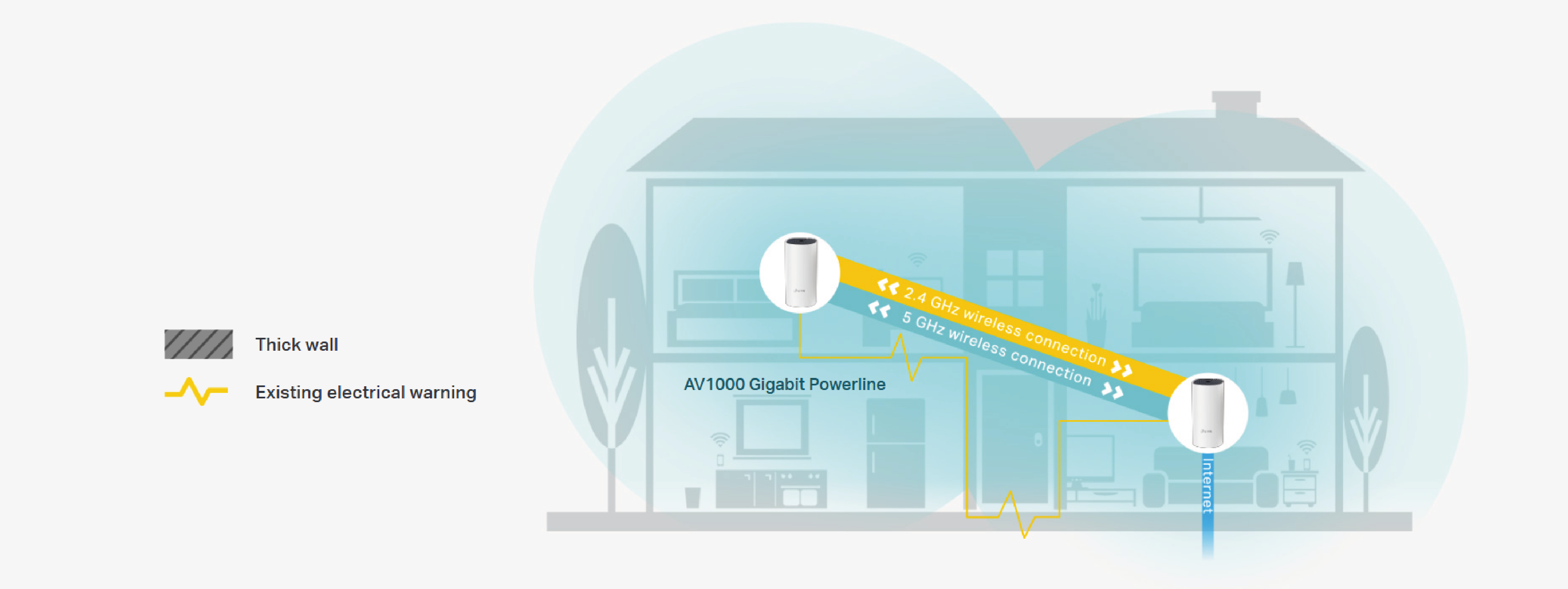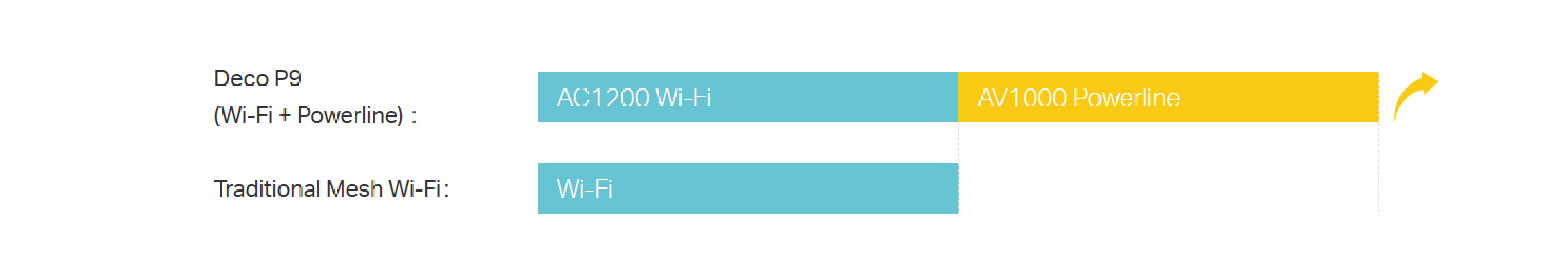 Transmisja danych pomiędzy urządzeniami Deco odbywa się na dwóch poziomach: bezprzewodowo i za pomocą sieci elektrycznej. Dzięki temu prędkość połączeń jest znacznie wyższa niż w przypadku urządzeń korzystających wyłącznie z rozwiązania Wi-Fi .