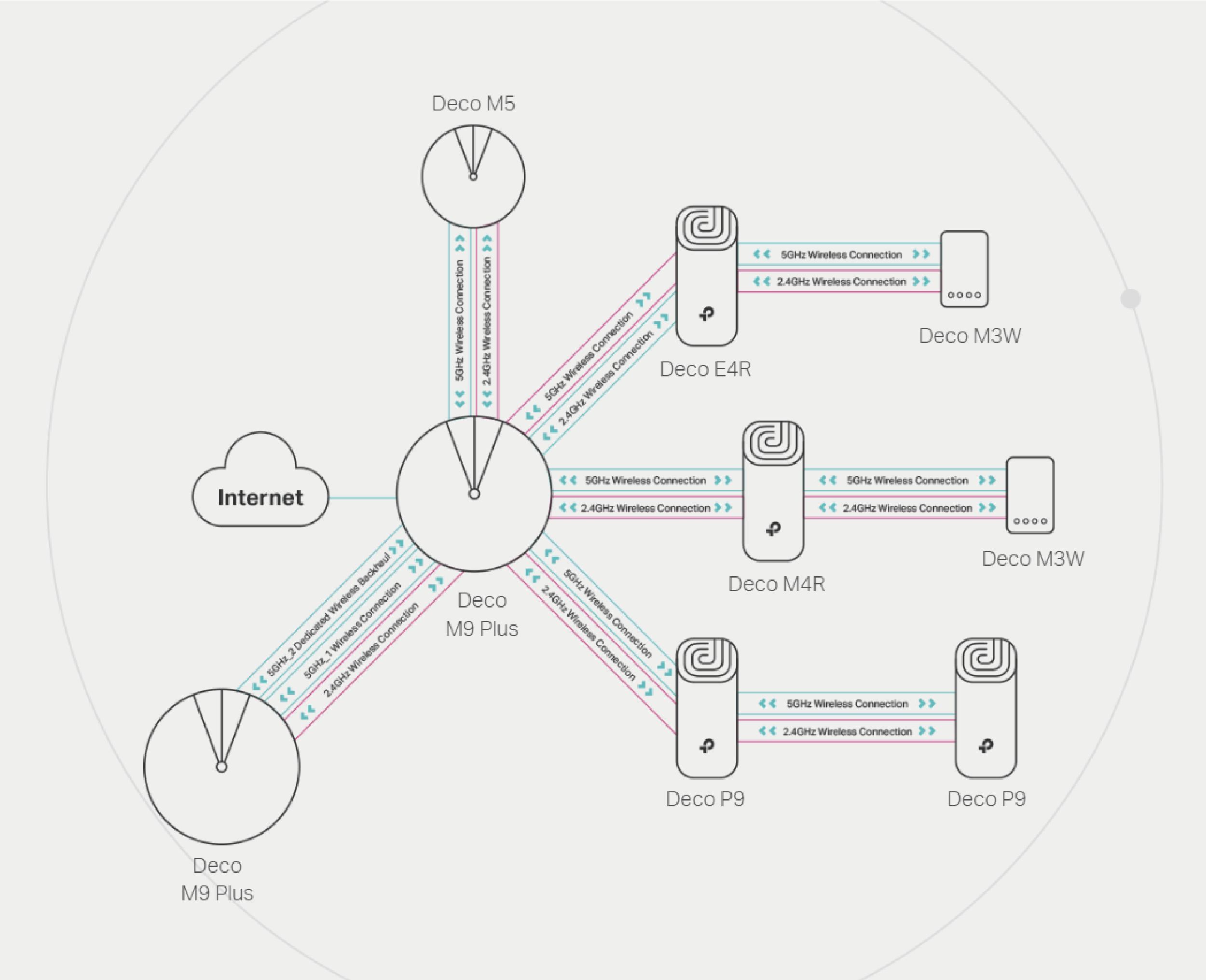Deco P9 może stworzyć sieć Mesh z każdym innym modelem Deco. Aby zwiększać zasięg sieci, wystarczy dodawać do niej kolejne urządzenia Deco.