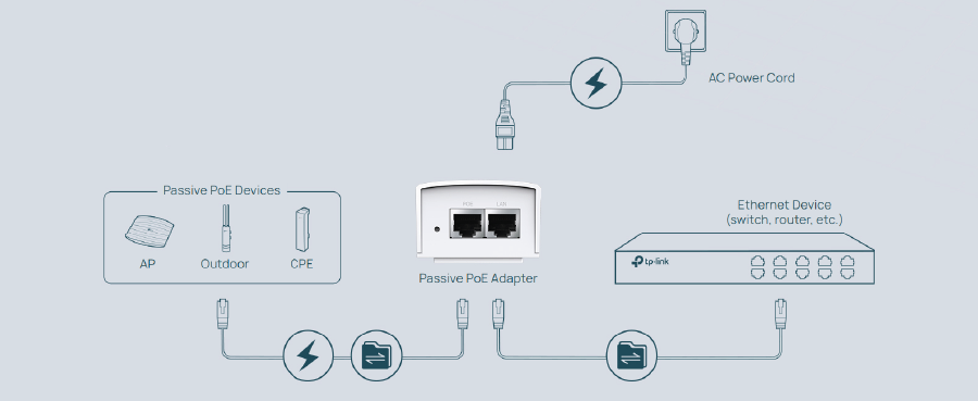 Skorzystaj z adaptera TL-POE4824G, aby przesyłać dane do swojego urządzenia PoE, jednocześnie dostarczając mu energię elektryczną.