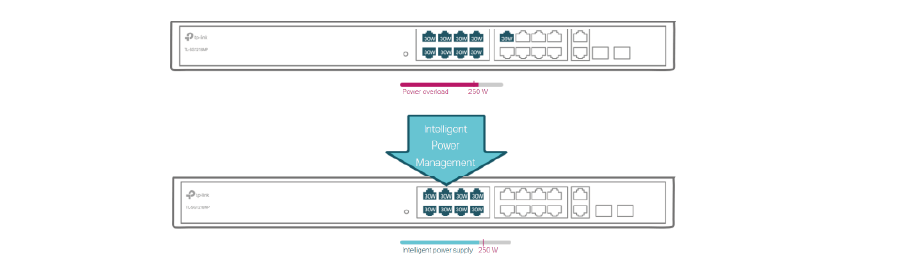 Gdy całkowity pobór mocy przekracza 250 W, funkcja inteligentnego zarządzania zużyciem energii wyłącza zasilanie portu o najniższym priorytecie, aby zapewnić zasilanie portów o wyższych priorytetach i tym samym chronić urządzenie przed przeciążeniem.