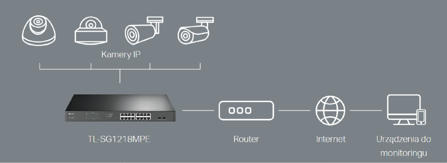 TL-SG1218MPE oferuje swoim użytkownikom możliwość monitorowania sieci i kontrolowania zmian w ruchu sieciowym. Korzystając z internetowego interfejsu użytkownika lub narzędzia do zarządzania użytkownik ma dostęp do wielu użytecznych funkcji, w tym monitorowania sieci, priorytetyzacji ruchu, a także usprawnionej usługi QoS.