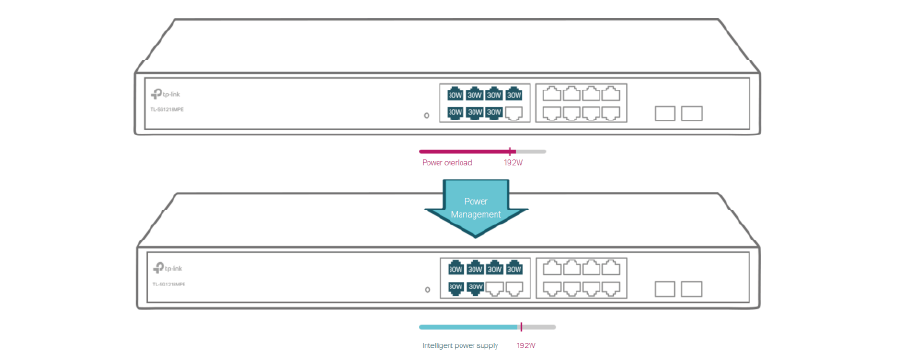Gdy całkowity pobór mocy przekracza 192 W, funkcja inteligentnego zarządzania zużyciem energii wyłącza zasilanie portu o najniższym priorytecie, aby zapewnić zasilanie portów o wyższych priorytetach i tym samym chronić urządzenie przed przeciążeniem.