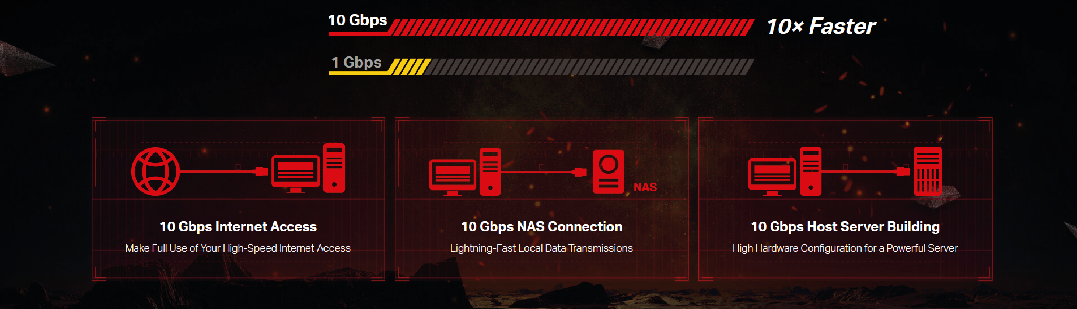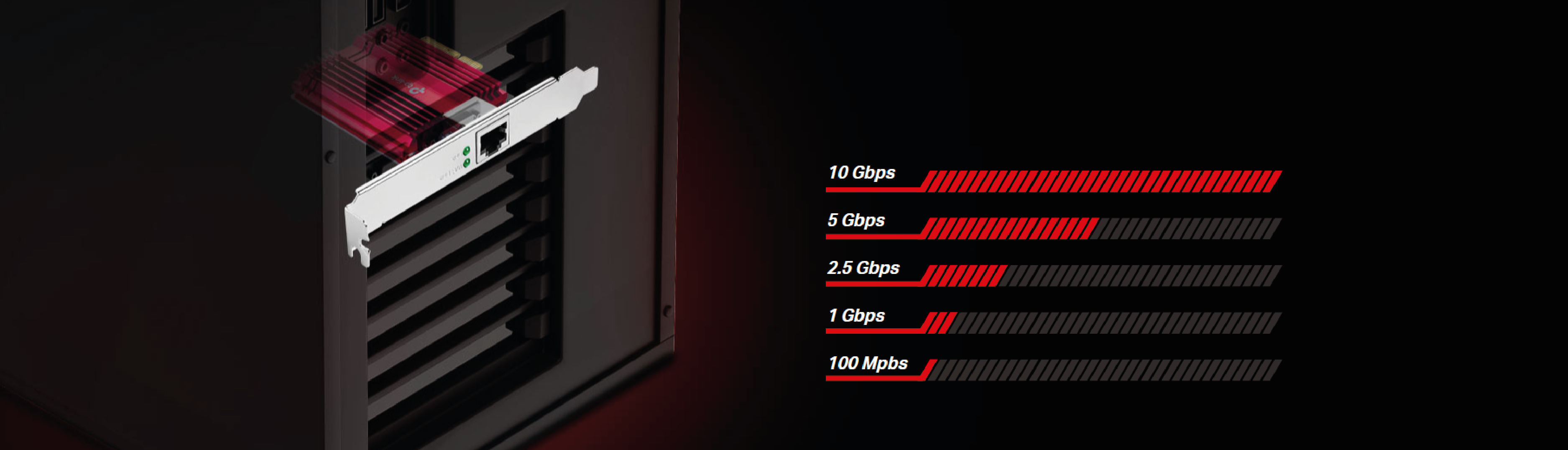 Technologia 10GBase-T jest zgodna ze standardami, które zapewniają prędkości wynoszące zarówno 10 Gb/s, 5 Gb/s, 2,5 Gb/s, jak i 1 Gb/s oraz 100 Mb/s standardu Base-T. Port 10G Ethernet automatycznie negocjuje szybkości połączeń, dzięki czemu bez problemu połączysz się z siecią 10G, gdy będzie taka możliwość.