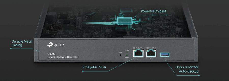 TP-Link OC300 to dedykowany sprzętowy kontroler centralnego zarządzania dla platformy Omada Software Defined Networking (SDN). Urządzenie jest przeznaczone do scentralizowanej konfiguracji, zarządzania i monitorowania punktów dostępowych, przełączników i routerów TP-Link EAP/JetStream/Omada Router w dużych i średnich sieciach biznesowych. Kontroler wyposażony jest w port Gigabit Ethernet do połączenia z siecią oraz porty USB 3.0 i USB 2.0 przeznaczone do automatycznego tworzenia kopii zapasowych konfiguracji. Obsługuje zarządzanie do 500 urządzeń Omada i do 15 000 klientów jednocześnie, co czyni go skalowalnym rozwiązaniem dla sieci o wysokiej gęstości. OC300 umożliwia zdalny dostęp chmurowy oraz lokalny dostęp przez interfejs webowy, eliminując potrzebę dedykowanego serwera PC do hostowania oprogramowania kontrolera. Jest zasilany zewnętrznym zasilaczem 12 V 1 A DC i jest przeznaczony do montażu w szafie rackowej (1 U).