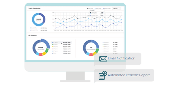 Łatwy w użytkowaniu panel jest bardzo pomocny w stałym monitorowaniu stanu sieci, sprawdzaniu poziomu zużycia przepustowości sieci i natężenia ruchu, uzyskiwaniu dostępu do dzienników ze statystykami sieci, otrzymywaniu powiadomień i ostrzeżeń, a nawet w śledzeniu kluczowych dla rozwoju firmy danych. Topologia sieci pozwala specjalistom ds. IT na szybką diagnozę ewentualnych problemów z nawiązywaniem połączeń.