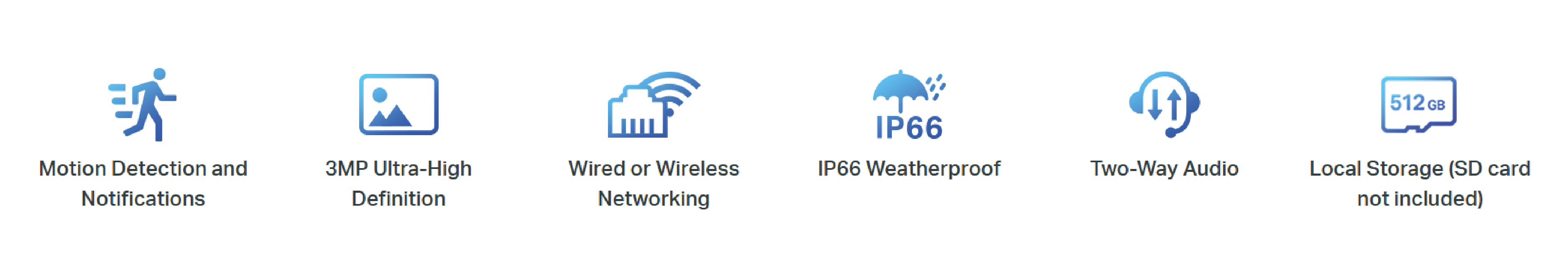 | Zawartość opakowania | Tapo C310 Zasilacz Szablon montażowy Kotwy i wkręty Wodoodporna uszczelka Wodoodporne mocowania kabli Instrukcja szybkiej instalacji |