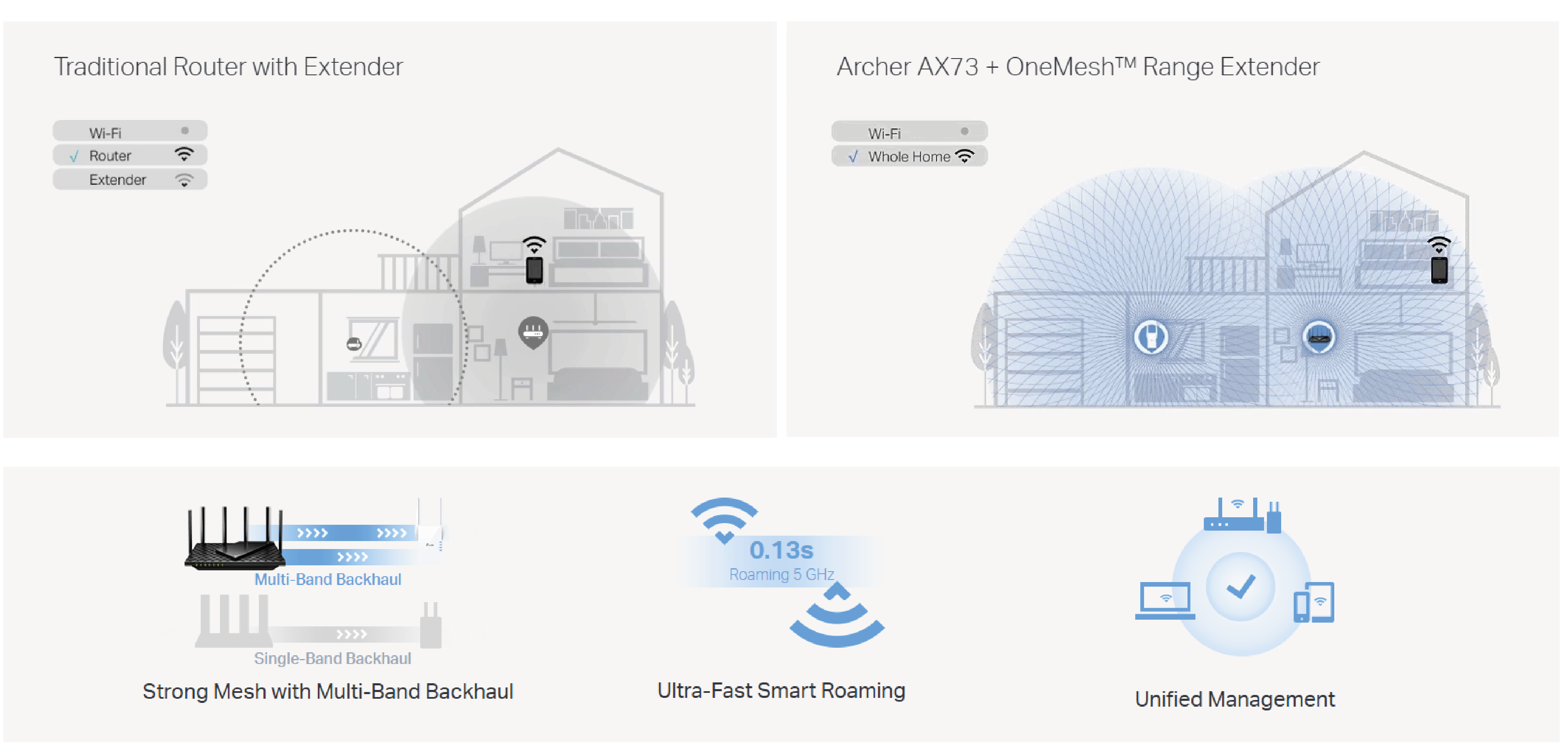 Chcesz utworzyć płynną sieć Wi-Fi, dostępną na całej powierzchni domu? Archer AX73 obsługuje technologię OneMesh, która zapobiega utratom połączenia z siecią i opóźnieniami w transmisji podczas przemieszczania się po domu.