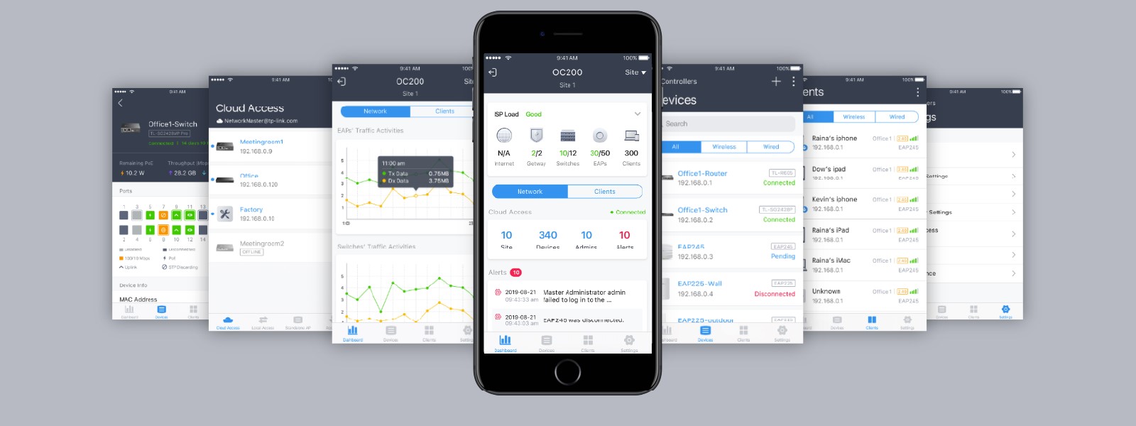 Narzędzia stworzone z myślą o przełącznikach EAP — kontroler sprzętowy Omada OC200 oraz oprogramowanie Omada Controller — to duże ułatwienie w zarządzaniu i monitorowaniu sieci Omada w czasie rzeczywistym. Natomiast dzięki usłudze cloud bezpieczny dostęp do platformy zarządzania można uzyskać z dowolnego miejsca.