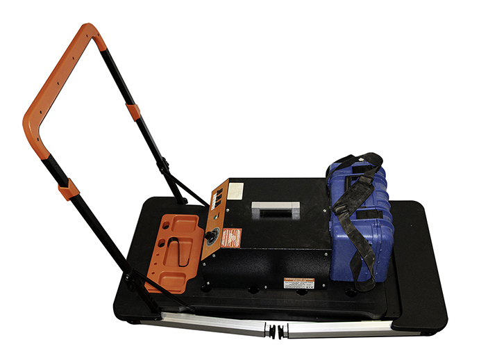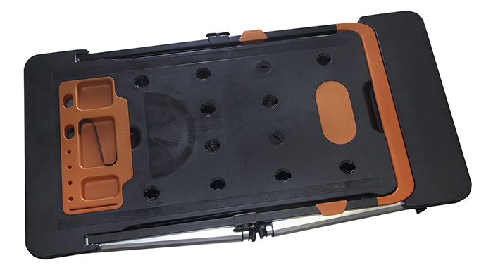 Podstawowa funkcja stołu warsztatowego znacznie ułatwia wykonywanie prac w terenie, np. spawanie włókien światłowodowych. Z boku znajduje się pomarańczowy pojemnik na drobne narzędzia i akcesoria.