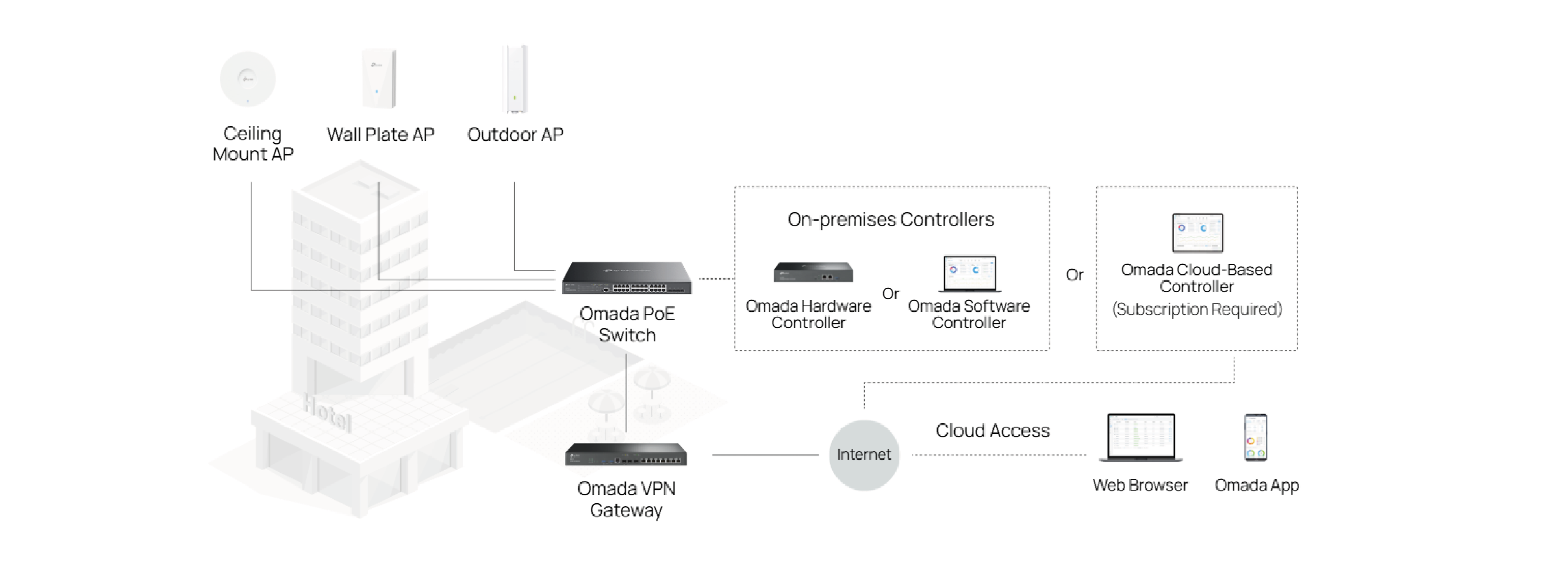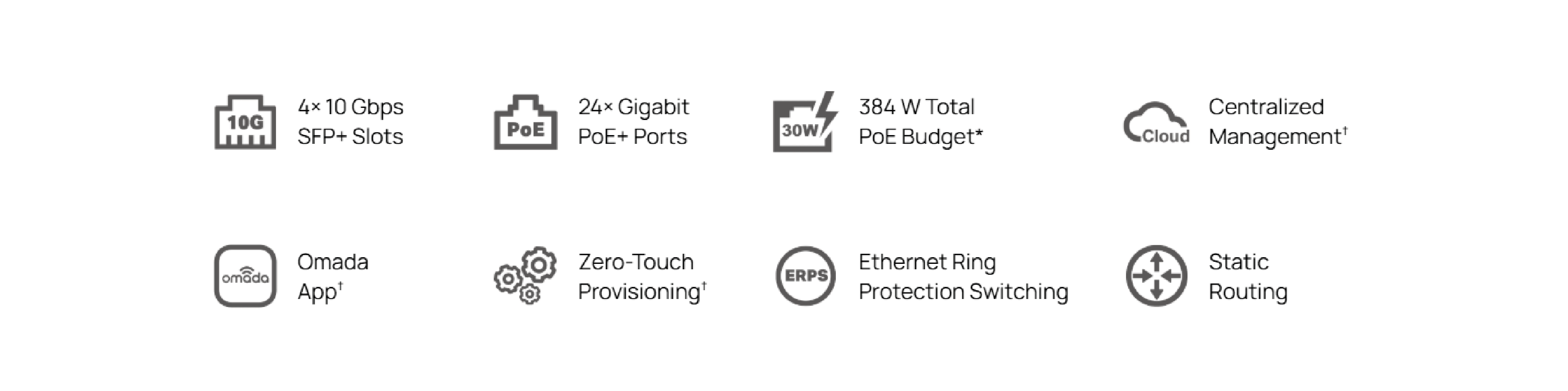 | Funkcje zaawansowane | • Wsparcie sprzętowego kontrolera Omada (OC200/OC300), Programowego kontrolera, Kontrolera opartego na chmurze • Automatyczne wykrywanie urządzeń • Konfiguracja Batch • Aktualizacja Firmware Batch • Inteligentne monitorowanie sieci • Ostrzeżenia o nieprzewidzianych zdarzeniach • Ujednolicona konfiguracja • Harmonogram Restartów • ZTP (Zero-Touch Provisioning)* |
