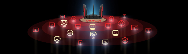 Archer GX90 zapewnia dostęp do 3 oddzielnych pasm Wi-Fi o łącznej prędkości dochodzącej do 6579 Mb/s. Pasmo dedykowane graczom wzbogacono o technologie 4T4R i HE160, dzięki czemu wszystkie platformy do gier mają do dyspozycji połączenia o prędkości 4804 Mb/s, a zakłócenia generowane przez inne urządzenia w ogólne nie są wyczuwalne.