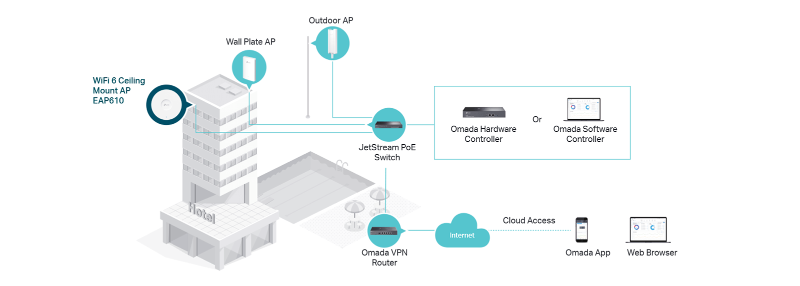 Platforma Omada umożliwia scentralizowane zarządzanie urządzeniami sieciowymi, m. in. punktami dostępowymi, switchami i routerami. Dostęp do konfiguracji jest możliwy lokalnie lub zdalnie, z wykorzystaniem usługi Cloud. Omada pozwala na monitorowanie pracy, zmianę ustawień czy aktualizowanie oprogramowania z poziomu jednej platformy.