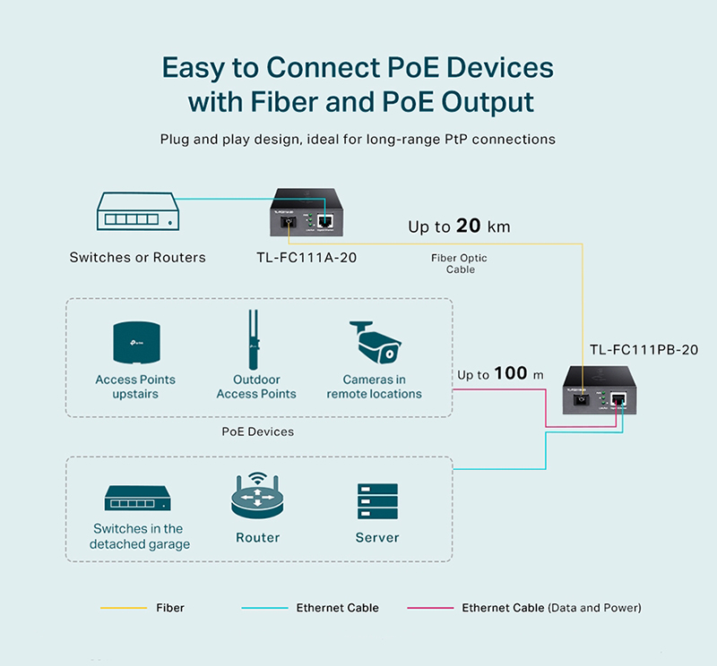 TP-Link FC111PB-20 to mediakonwerter światłowodowy typu WDM, przeznaczony do użytku z 1 włóknem typu singlemode. Posiada wbudowany laser, który nadaje na fali o długości 1310nm i odbiera na fali 1550nm, zastosowano standardowe złącze SC/UPC. Po drugiej stronie należy zastosować konwerter, który nadaje na fali 1550nm i odbiera na fali 1310nm. Przepustowość połączenia wynosi maksymalnie 100 Mb/s, a zasięg 20 km. Dodatkowym atutem jest wyjście zasilania PoE w standardzie 802.3af - do mediakonwertera możesz podłączyć bezpośrednio kamerę.