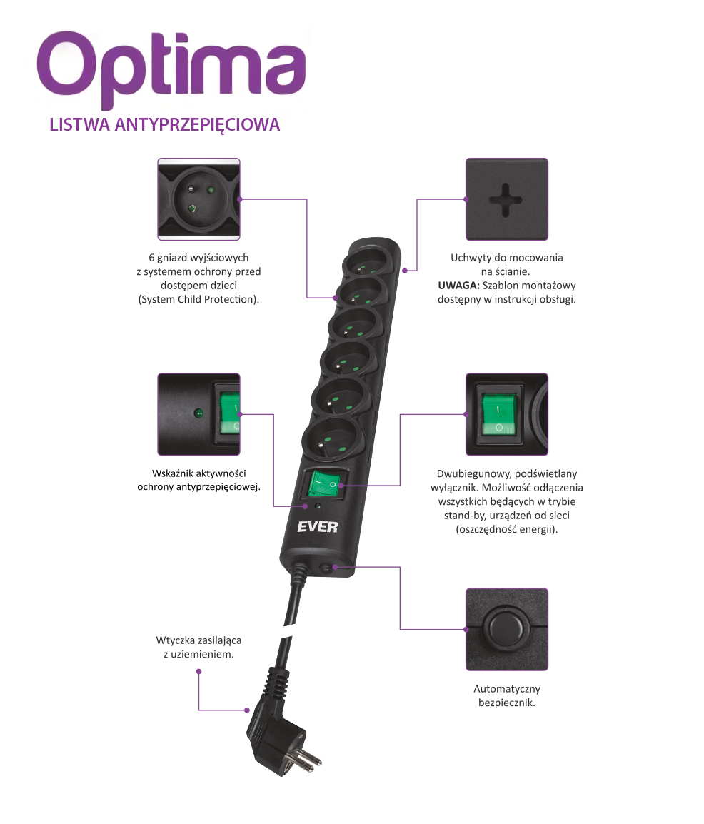 Ever Optima to antyprzepięciowa listwa wyposażona w 6 gniazd sieciowych. Posiada kabel zasilający o długości 5 m zakończony wtyczką z uziemieniem. Wewnątrz obudowy znajduje się automatyczny bezpiecznik 10 A, który po włączeniu zabezpieczenia przepięciowego / zwarciowego możesz ponownie włączyć. Każde gniazdko posiada system Child Protection - uniemożliwia dzieciom dostęp do elementów będących pod napięciem. Listwa jest wyposażona w dwubiegunowy, podświetlany włącznik.
