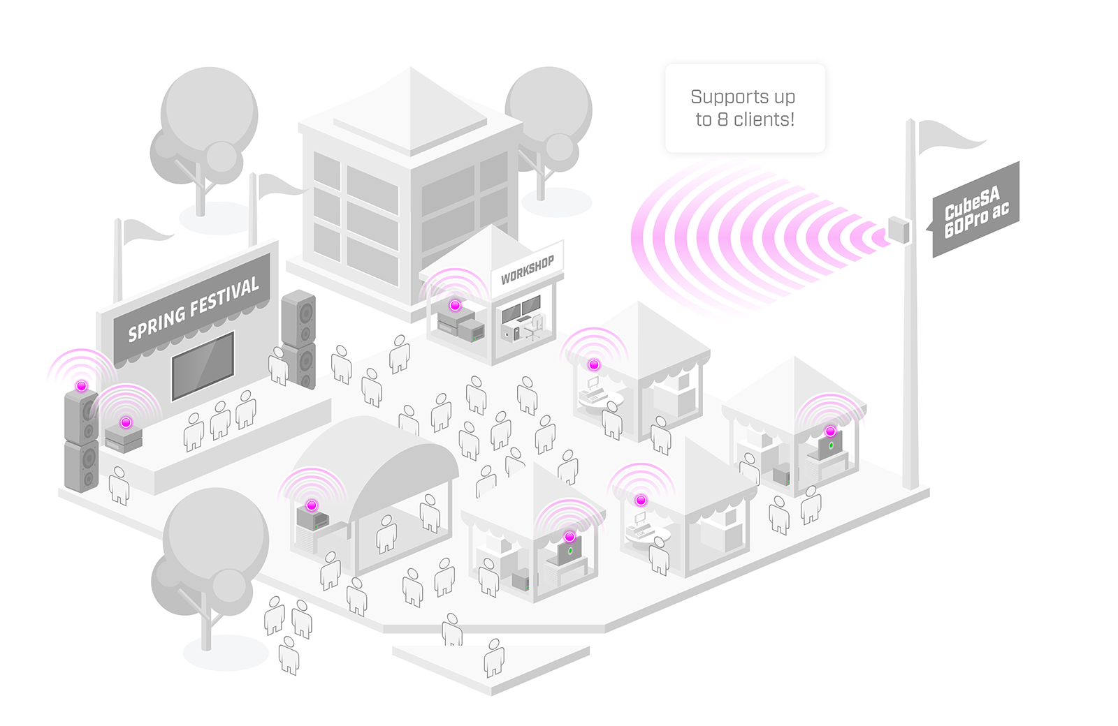 CubeSA 60Pro ac posiada zintegrowaną antenę sektorową i umożliwia podłączenie do 8 urządzeń klienckich. Maksymalny zasięg transmisji tego typu wynosi około 600 metrów, a łączna przepustowość 1 Gb/s. MikroTik wykorzystał nowoczesny standard IEEE 802.11ay, następce wcześniej używanego IEEE 802.11ad. Sieć PTMP w paśmie 60 GHz sprawdzi się w wielu zastosowaniach, w których potrzebna jest duża przepustowość połączenia. Przykładowo może być to festiwal lub kampus (jak na powyższym schemacie) albo podłączenie kilku firm w przemysłowej strefie.