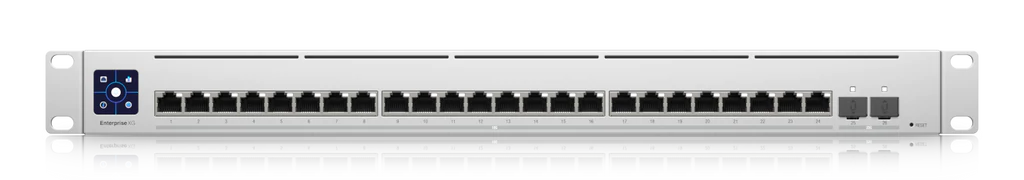 Ubiquiti USW-EnterpriseXG-24 to wydajny switch przeznaczony do pracy w systemie UniFi. Został wyposażony w 24 porty 10G Ethernet oraz 2 sloty SFP28 (25 Gb/s), łączna przepustowość przełączania wynosi 290 Gb/s, a prędkość przekazywania pakietów 431,52 Mp/s. Urządzenia z serii USW-Enterprise, podobnie jak USW-Pro, mają funkcjonalność zarządzania Layer 3. Switch posiada dotykowy ekran LCD 1,3", na którym możesz znaleźć podstawowe informacje dotyczące pracy. Produkt wyróżnia się niewielkim poborem mocy - do 100 W oraz możliwością podłączenia drugiego źródła zasilania poprzez złącze RPS (kompatybilne tylko z systemem USP-RPS).