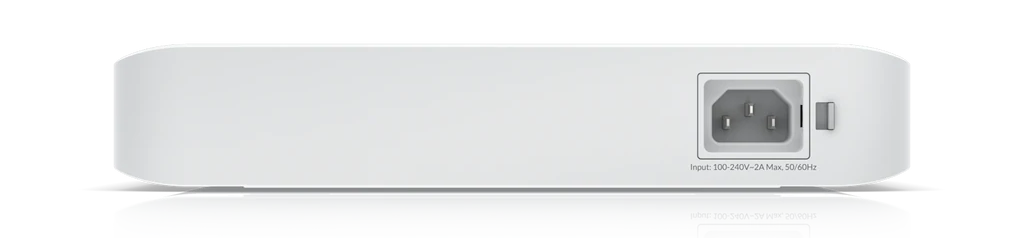 Switch został wyposażony we wbudowany zasilacz AC o mocy 150 W. 120 W zostało zarezerwowane na zasilanie PoE, urządzenie samo w sobie nie pobiera dużo mocy. Wykorzystano pasywny system chłodzenia, USW-Enterprise-8-PoE pracuje bezgłośnie. Obudowa została wykonana z tworzywa sztucznego, umożliwia montaż na ścianie lub postawienie na biurku (typ desktop).