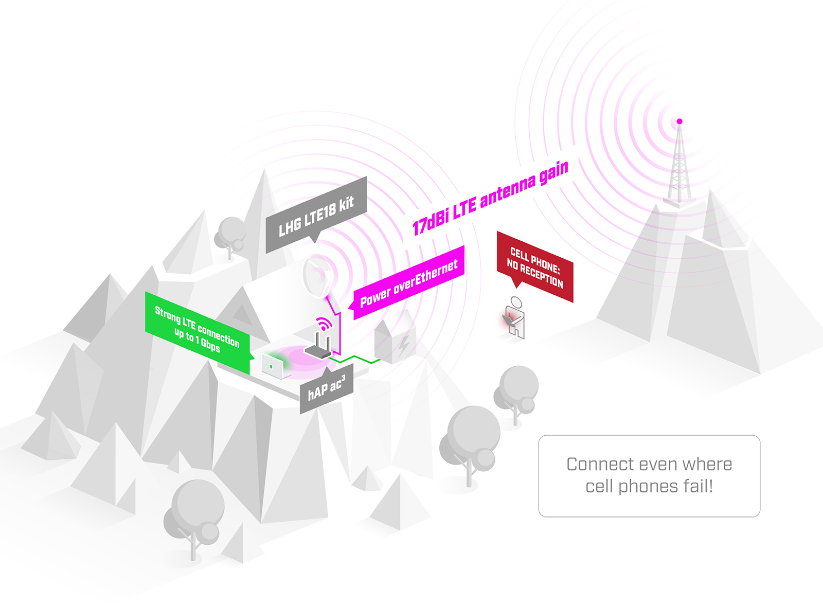 Dzięki dużej przepustowości LHGGM&EG18-EA sprawdzi się w wielu lokalizacjach. Oczywistym miejscem montażu są tereny wiejskie, ale agregacja wielu pasm poprawi także jakość transmisji w przypadku dużego obciążenia stacji nadawczej.