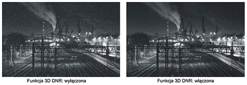 - 3D DNR - (Digital Noise Reduction) - Cyfrowa redukcja szumów to system aktywnej ochrony obrazu przed ewentualnymi zakłóceniami mogącymi pojawić się w trakcie rejestrowania nagrań. Funkcja DNR nieustannie analizuje przechwytywane nagrania wykorzystując metodę porównawczą następujących po sobie klatek obrazu, jak i poszczególnych pikseli. Dzięki temu rozwiązaniu możliwe jest zapisywanie czystych i przejrzystych nagrań zarówno w dzień, jak i w nocy.