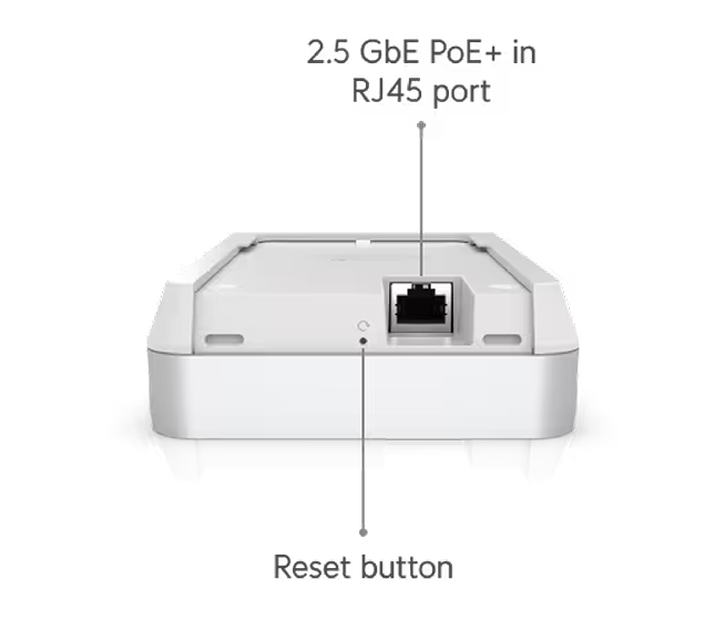 Punkt dostępowy jest wyposażony w 1 port 2.5G Ethernet (1000 / 2500 Mb/s). Został umiejscowiony w dolnej części obudowy tak, aby był do niego prosty dostęp. Port Ethernet służy jednocześnie za wejście zasilania PoE+ (802.3at), maksymalny pobór mocy wynosi 22 W. W zestawie nie został dołączony zasilacz, należy zastosować zasilacz PoE+ lub switch obsługujący PoE+.