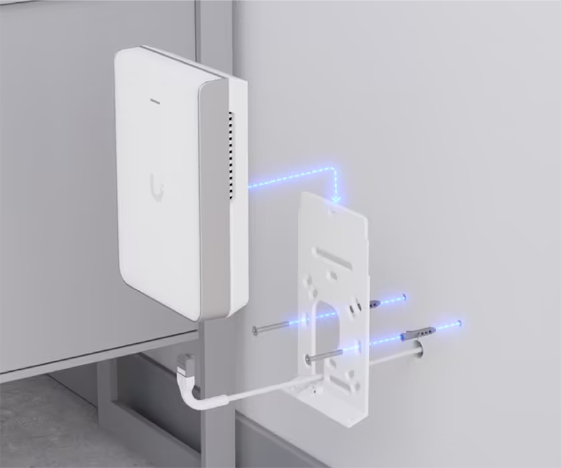 Obudowa U7 Pro Wall została przystosowana do montażu naściennego. Urządzenie możesz przymocować bezpośrednio do ściany korzystając z kołków montażowych lub zamontować na podtynkowej puszce. W zestawie znajdziesz odpowiednie kołki i śruby.