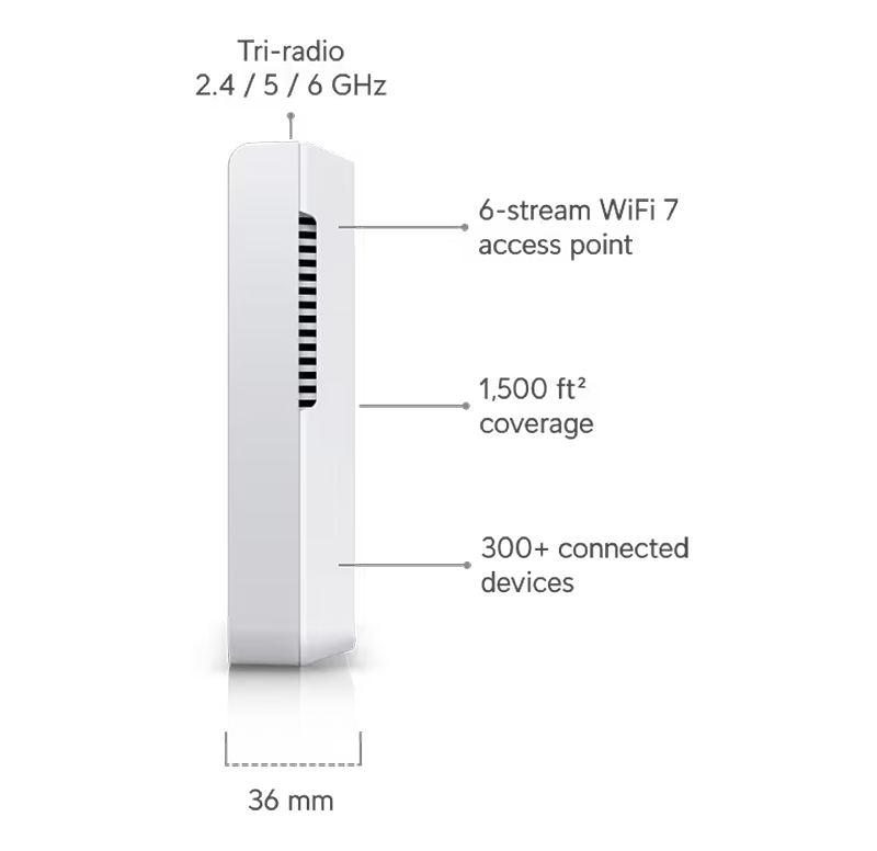 Urządzenie wspiera standard Wi-Fi 7, obsługuje protokoły IEEE 802.11 b/g/n/ax/be w 2,4 GHz, IEEE 802.11 a/n/ac/ax/be w 5 GHz i IEEE 802.11 be w 6 GHz. Maksymalna teoretyczna przepustowość wynosi odpowiednio 688 Mb/s w 2,4 GHz. 4324 Mb/s w 5 GHz oraz 5764 Mb/s w 6 GHz. Tak dużą prędkość można uzyskać dzięki zastosowaniu szerszych kanałów i wyższej modulacji niż w urządzeniach Wi-Fi 6 / 6E. U7 Pro Wall obsługuje kanały o szerokości do 320 MHz i modulację 4096QAM.